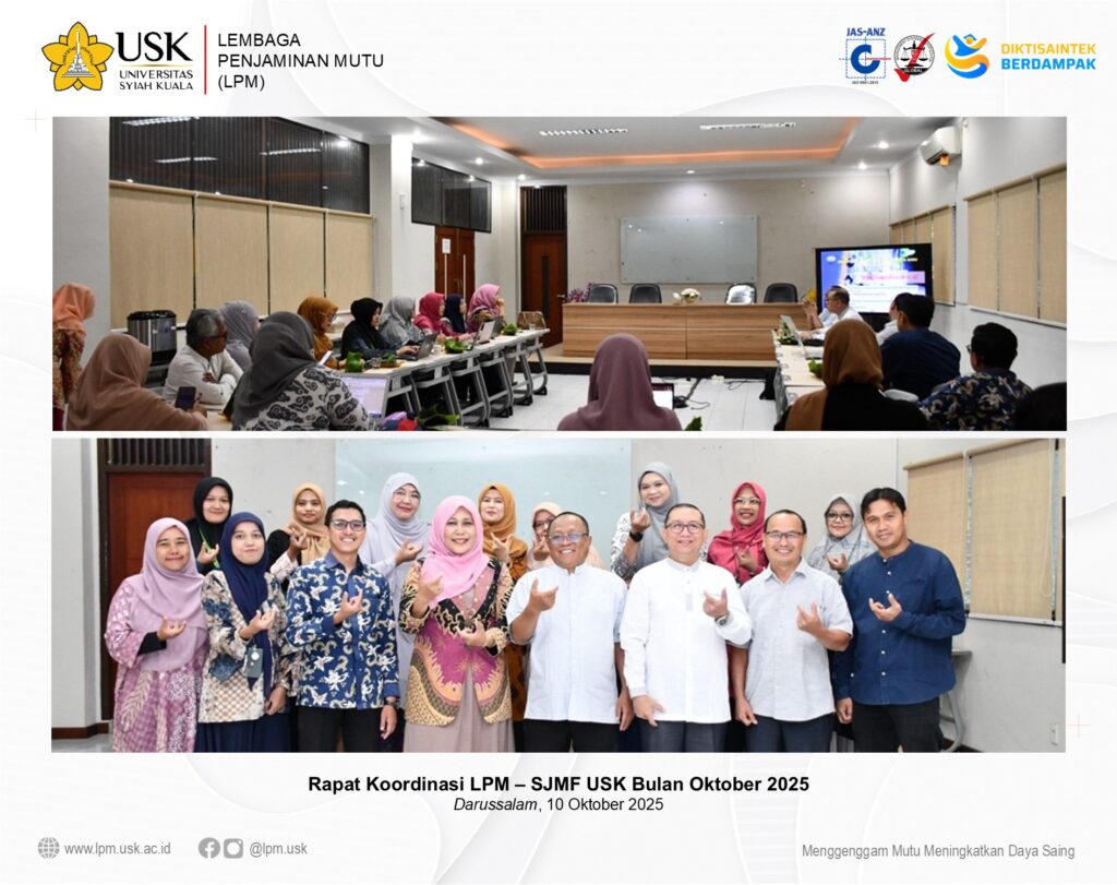 Darussalam, 10 Oktober 2025 – Lembaga Penjaminan Mutu (LPM) Universitas Syiah Kuala (USK) bersama Satuan Jaminan Mutu Fakultas (SJMF) USK menggelar Rapat Koordinasi LPM–SJMF yang berlangsung di Ruang Diklat FEB USK pada Jumat, 10 Oktober 2025. Kegiatan ini bertujuan memperkuat sinergi dalam implementasi sistem penjaminan mutu internal di lingkungan universitas.