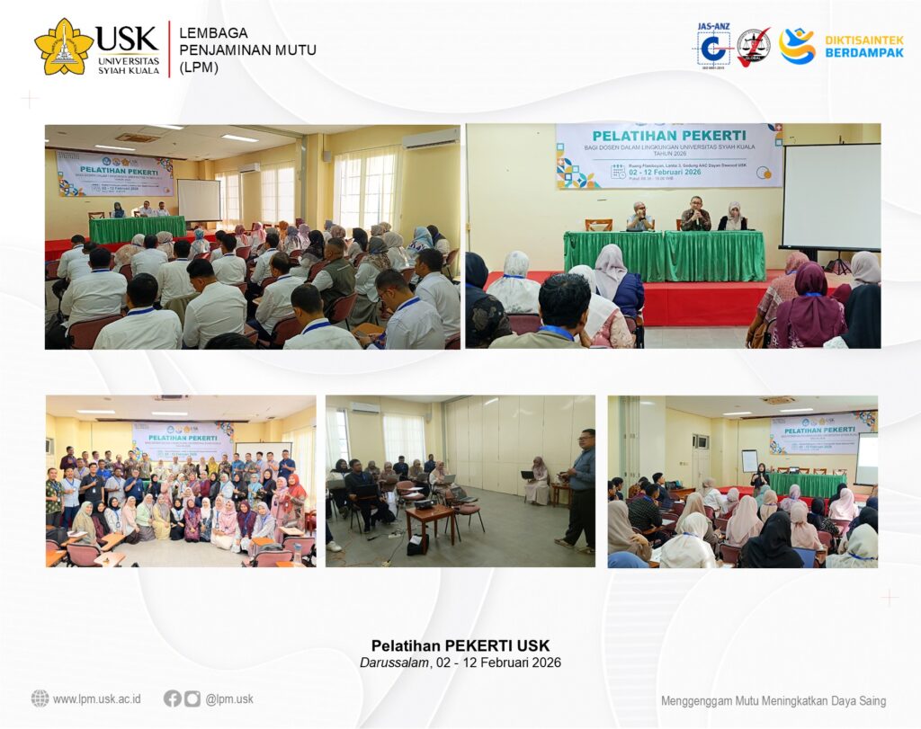 Darussalam, 12 Februari 2026 – Lembaga Penjaminan Mutu (LPM) Universitas Syiah Kuala (USK) kembali menunjukkan komitmennya dalam meningkatkan kualitas pembelajaran dengan menyelenggarakan Pelatihan Peningkatan Keterampilan Dasar Teknik Instruksional (PEKERTI) Tahun 2026. Kegiatan ini dilaksanakan secara luring pada 2 – 12 Februari 2026 di Ruang Flamboyan Lantai 3, Gedung AAC Dayan Dawood, Universitas Syiah Kuala.