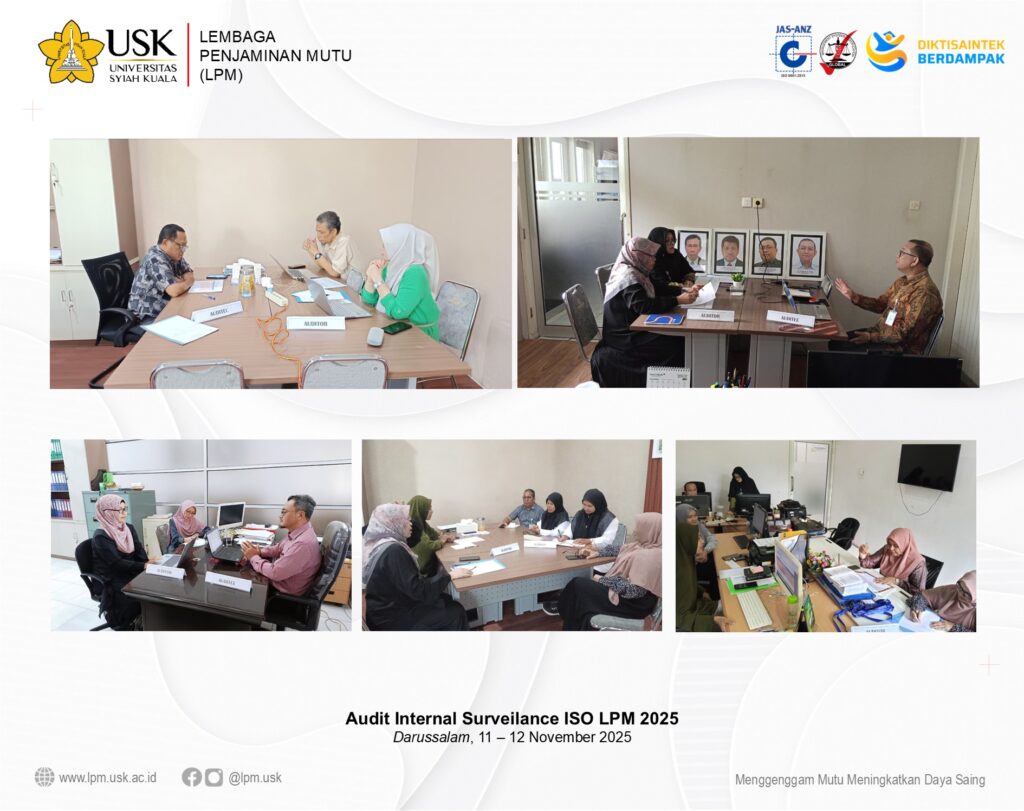 Darussalam, 13 November 2025 – Lembaga Penjaminan Mutu (LPM) Universitas Syiah Kuala (USK) melaksanakan Audit Internal untuk periode November 2024 hingga Oktober 2025. Kegiatan ini tidak hanya menjadi bagian dari pemenuhan siklus Sistem Penjaminan Mutu Internal (SPMI), tetapi juga merupakan langkah strategis LPM sebagai pemegang sertifikat ISO 9001:2015 dalam mempersiapkan Surveilance Audit yang akan dilaksanakan oleh Management System Certification (MSC) Global.