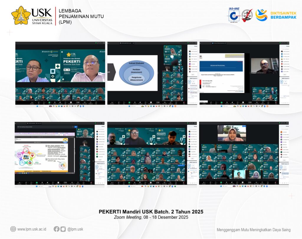 Darussalam, 18 Desember 2025 – Lembaga Penjaminan Mutu (LPM) Universitas Syiah Kuala (USK) menyelenggarakan Pelatihan Peningkatan Keterampilan Dasar Teknik Instruksional (PEKERTI) Mandiri Tahun 2025 Batch 2 yang dilaksanakan secara daring melalui Zoom Meeting pada tanggal 8 – 18 Desember 2025.