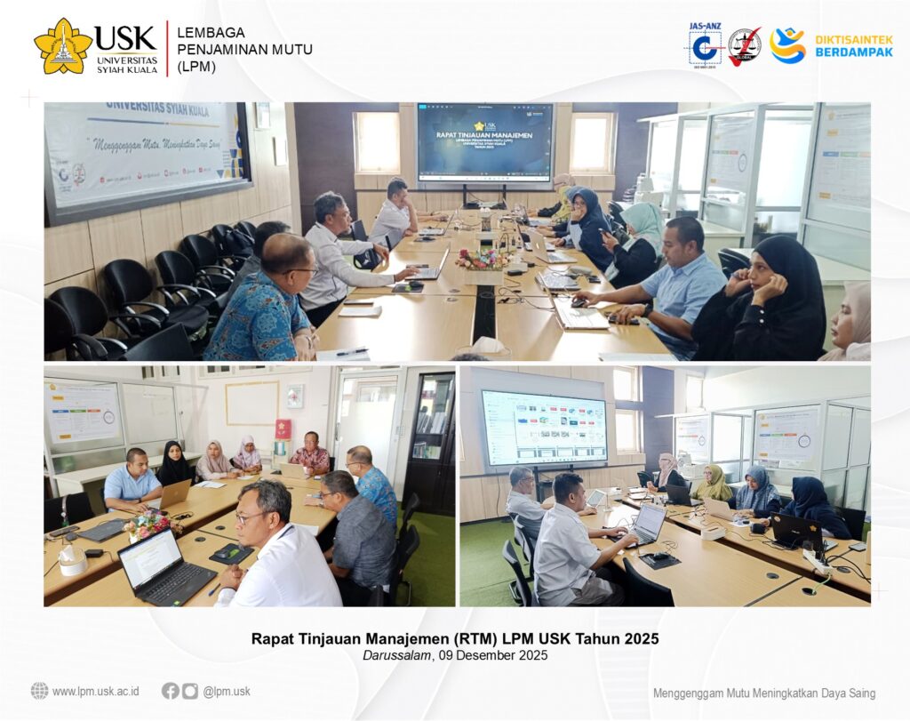 Darussalam, 09 Desember 2025 – LPM USK melaksanakan Rapat Tinjauan Manajemen (RTM) di ruang rapat Pusat Pengembangan Biro Rektorat Lama Lt. 2, Kantor Pusat Administrasi (KPA) USK, sebagai tindak lanjut dari audit internal yang dilakukan sebelumnya. Tujuan pelaksanaan RTM ini adalah untuk mengevaluasi kinerja dan aktifitas Lembaga ditahun sebelumnya berdasarkan temuan-temuan yang diperoleh pada saat audit internal. Hasil dari RTM memberikan informasi tentang kinerja dan efektivitas pelaksanaan manajemen, mencakup keputusan dan tindakan yang diambil untuk melakukan perbaikan kedepan.